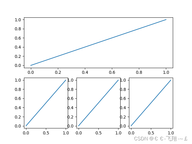 def matplotlib_subplot(): plt.figure() # 生成繪圖面板 plt.subplot(2, 1, 1) # 兩行1列繪圖位置的第1個位置 plt.plot([0, 1], [0, 1]) # 繪制從(0,0)繪制到(1,1)的圖像 plt.subplot(2, 3, 4) # 兩行3列繪圖位置的第4個位置 plt.plot([0, 1], [0, 1]) # 繪制從(0,0)繪制到(1,1)的圖像 plt.subplot(2, 3, 5) # 兩行3列繪圖位置的第5個位置 plt.plot([0, 1], [0, 1]) # 繪制從(0,0)繪制到(1,1)的圖像 plt.subplot(2, 3, 6) # 兩行3列繪圖位置的第6個位置 plt.plot([0, 1], [0, 1]) # 繪制從(0,0)繪制到(1,1)的圖像 plt.show()