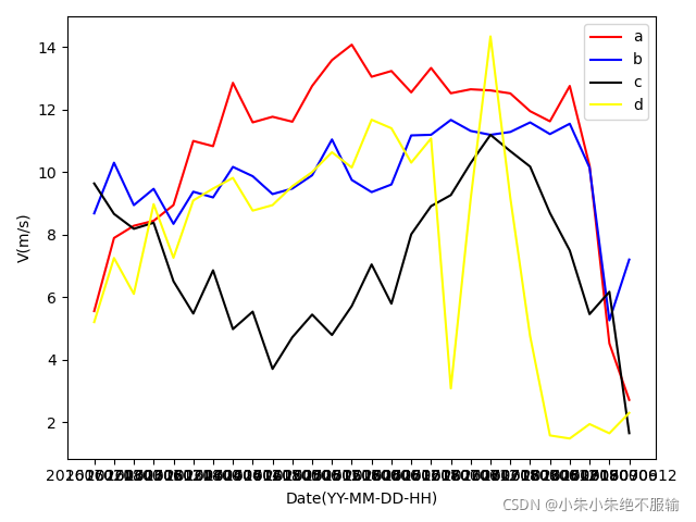 plt.plot(Date, V1, 'r', label='a') plt.plot(Date, V2, 'blue', label='b') plt.plot(Date, V3, 'black', label='c') plt.plot(Date, V4, 'yellow', label='d')