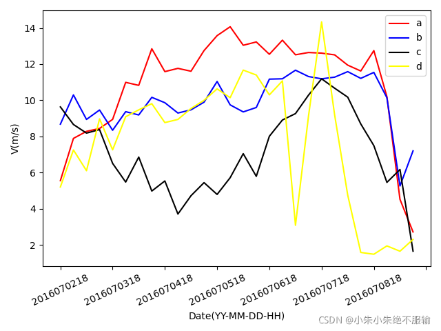 import matplotlib.pyplot as plt import matplotlib.ticker as ticker # 根據(jù)ticker的功能改變第一個為初始的數(shù)據(jù),第二個則為間隔 ticker_spacing = Date # 日期的字符串?dāng)?shù)組 ticker_spacing = 4 # 創(chuàng)建畫布 fig, ax = plt.subplots(1, 1) plt.plot(Date, V1, 'r', label='a') plt.plot(Date, V2, 'blue', label='b') plt.plot(Date, V3, 'black', label='c') plt.plot(Date, V4, 'yellow', label='d') # rotation=30 為傾斜的度數(shù),因為日期較長,需要傾斜才能更清晰顯示 ax.xaxis.set_major_locator(ticker.MultipleLocator(ticker_spacing)) plt.xticks(rotation=30)