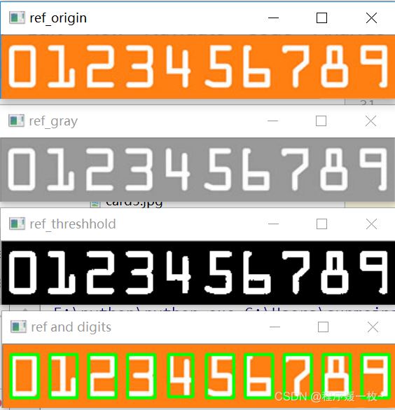 OCR-A 參考字體識(shí)別如下:原始圖 VS 灰度圖 VS 閾值化圖 VS 輪廓每個(gè)數(shù)字提取圖: