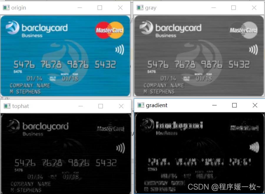 識(shí)別過(guò)程1——原圖 VS 灰度圖 VS 白帽圖 VS 梯度圖如下: