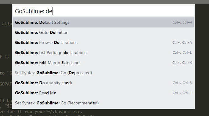 然后使用 'ctrl+.'調(diào)起gosublime控制器,選中 default Settings,回車