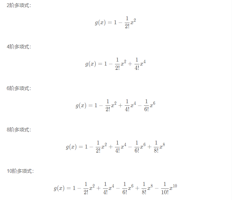 這里我們先列舉出f(x) = cosx在原點(diǎn)的泰勒2階、4階、6階、8階、10階的多項(xiàng)式,并用圖像表示該函數(shù)及其泰勒n階多項(xiàng)式。