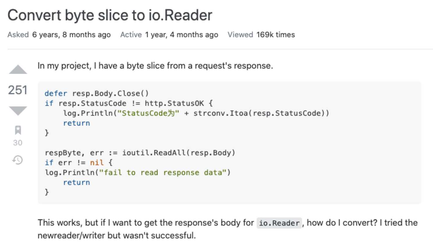 在 stackoverflow 上看到一個(gè)問題,題主進(jìn)行了一個(gè)網(wǎng)絡(luò)請(qǐng)求,接口返回的是 []byte。如果想要將其轉(zhuǎn)換成 io.Reader,需要怎么做呢?