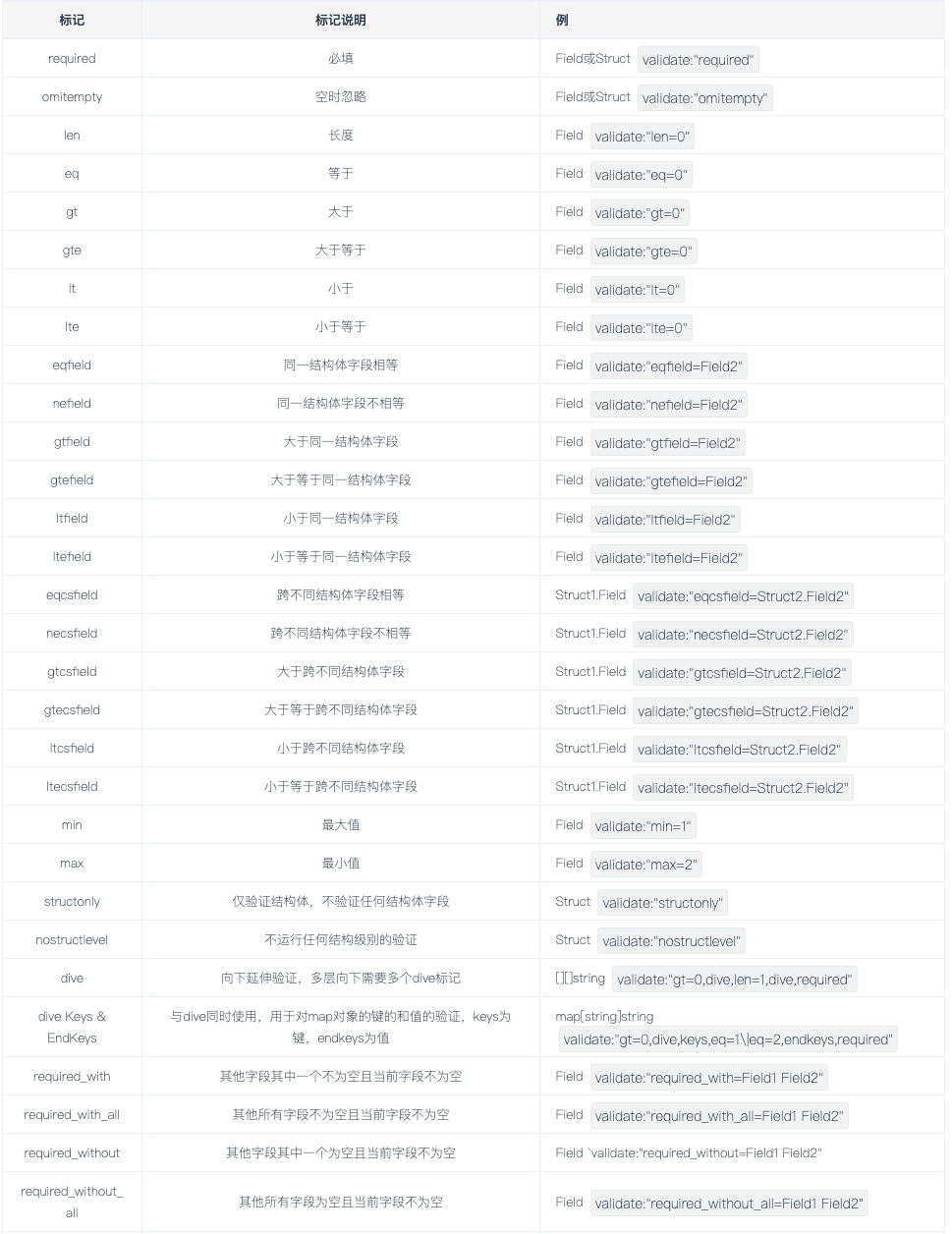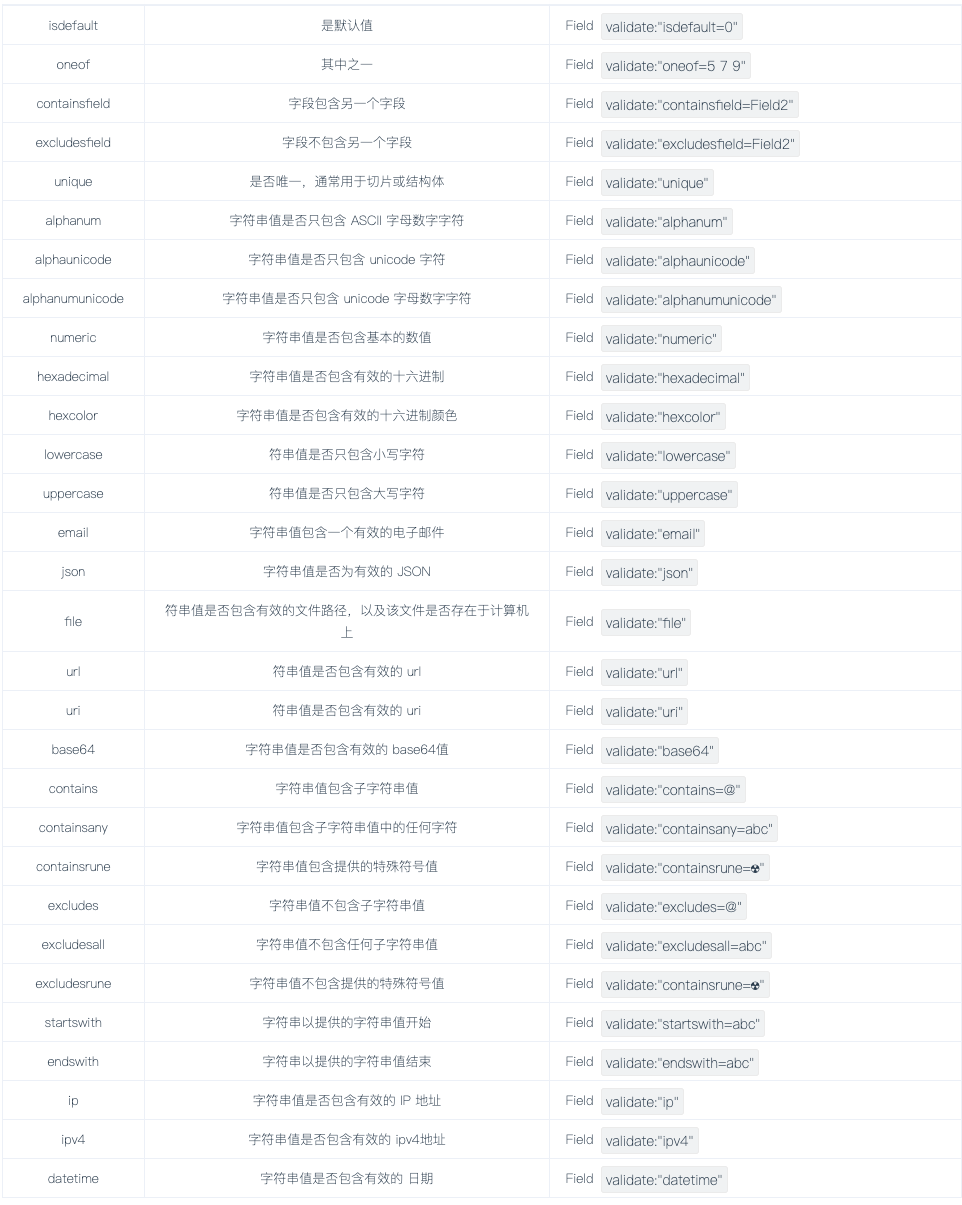 excludesall:不包含參數(shù)中任意的UNICODE字符,例如excludesall=ab;excludesrune:不包含參數(shù)表示的 rune 字符,excludesrune=asong;startswith:以參數(shù)子串為前綴,例如startswith=hi;endswith:以參數(shù)子串為后綴,例如endswith=bye。contains=:包含參數(shù)子串,例如contains=email;containsany:包含參數(shù)中任意的 UNICODE 字符,例如containsany=ab;containsrune:包含參數(shù)表示的 rune 字符,例如`containsrune=asong;excludes:不包含參數(shù)子串,例如excludes=email;