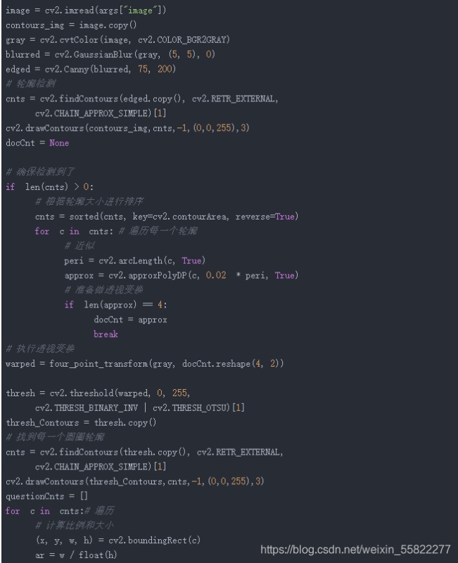 if len(cnts) > 0: # 根據(jù)輪廓大小進(jìn)行排序 cnts = sorted(cnts, key=cv2.contourArea, reverse=True) for c in cnts: # 遍歷每一個(gè)輪廓# 近似 peri = cv2.arcLength(c, True) approx = cv2.approxPolyDP(c, 0.02 * peri, True) # 準(zhǔn)備做透視變換 if len(approx) == 4: docCnt = approx break