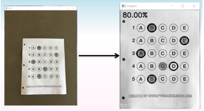 # 與正確答案進(jìn)行對比 color = (0, 0, 255) k = ANSWER_KEY[q] # 判斷正確if k == bubbled[1]: color = (0, 255, 0) correct += 1 cv2.drawContours(warped, [cnts[k]], -1, color, 3) #繪圖