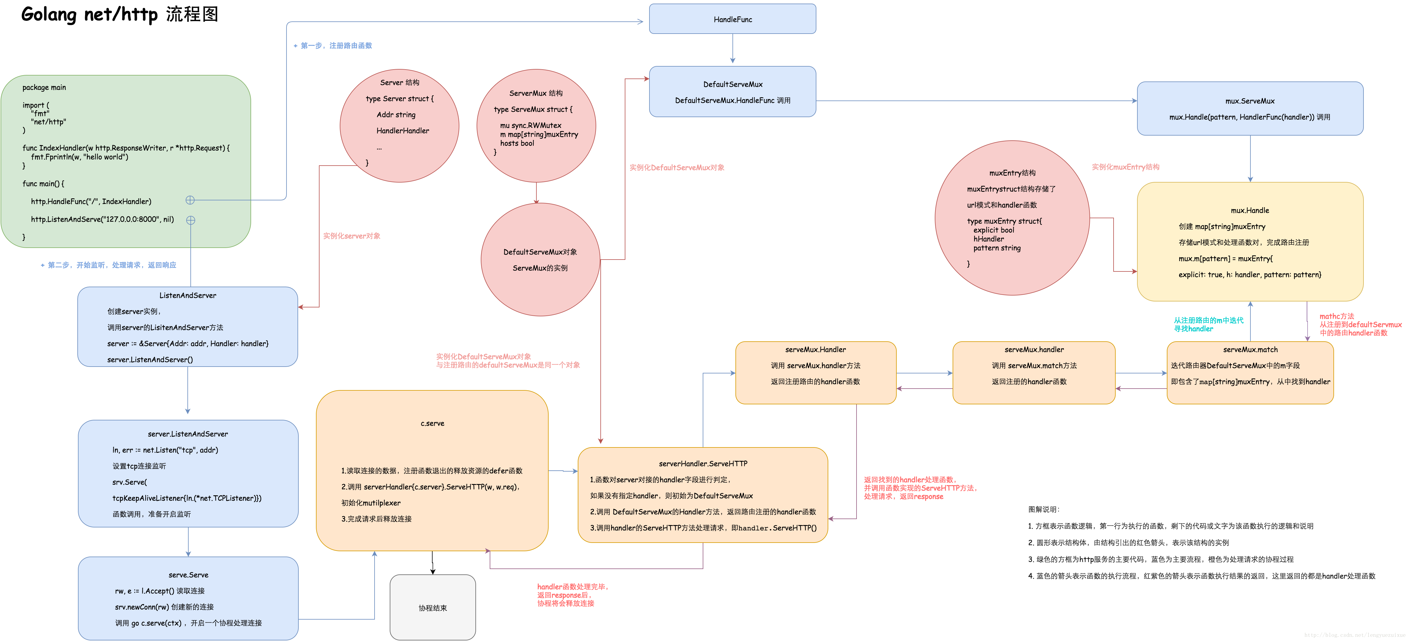 ? ?Golang的http處理流程可以用下面一張圖表示,后面內(nèi)容是針對圖進行說明: