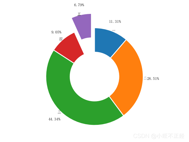 import matplotlib.pyplot as pl pl.rcParams['font.sans-serif'] = ['FangSong'] x = ['一','二','三','四','五'] y = [25,63,98,20,15] pl.pie(y,labels=x,labeldistance=1,autopct='%.2f%%',pctdistance=1.2,explode=[0,0,0,0,0.3],startangle=90,counterclock=False) pl.show()