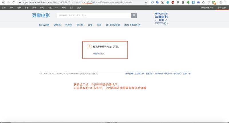 為什么我們之前的案例(京東、優(yōu)酷等)中不需要登錄,而今天爬取豆瓣需要登錄呢?那是因?yàn)槎拱暝跊](méi)有登錄狀態(tài)情況下只允許你查看前200條影評(píng),之后就需要登錄才能查看,這也算是一種反扒手段!