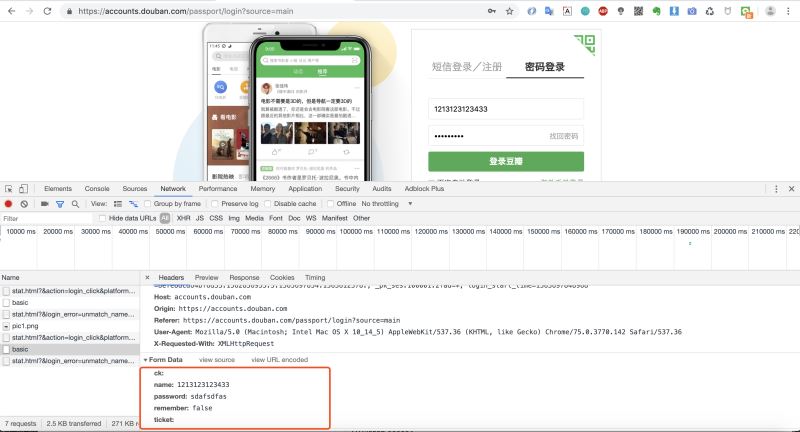 這里豬哥建議輸入錯(cuò)誤的密碼,這樣就不會(huì)因?yàn)轫?yè)面跳轉(zhuǎn)而捕捉不到請(qǐng)求!上面我們便獲取到登錄請(qǐng)求的URL:https://accounts.douban.com/j/mobile/login/basic