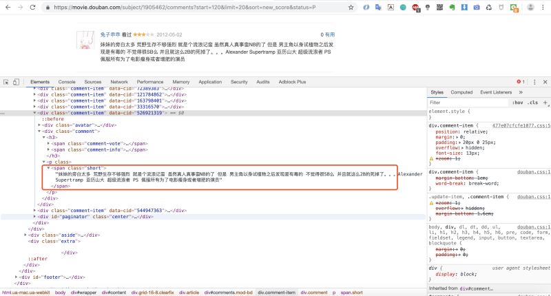 我們發(fā)現(xiàn)影評(píng)內(nèi)容都是在<span class="short"></span>這個(gè)標(biāo)簽里,那我們 就可以寫(xiě)正則來(lái)匹配這個(gè)標(biāo)簽里的內(nèi)容啦!