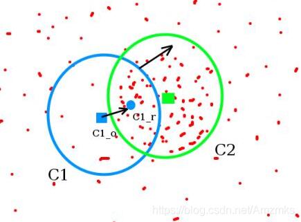 第一個(gè)窗口C1是藍(lán)色圓圈的區(qū)域。藍(lán)色環(huán)的中心用藍(lán)色矩形標(biāo)記并命名為 C1_o。窗口中所有點(diǎn)的點(diǎn)集形成的質(zhì)心在藍(lán)色圓形點(diǎn)C1_r。顯然,質(zhì)心和環(huán)的質(zhì)心不重合。移動(dòng)藍(lán)色窗口,使質(zhì)心與先前獲得的質(zhì)心重合。在新移動(dòng)的圓環(huán)的區(qū)域內(nèi)再次找到圓環(huán)包圍的點(diǎn)集的質(zhì)心,然后再次移動(dòng)。通常,形心和質(zhì)心不重合。繼續(xù)執(zhí)行上述移動(dòng)過(guò)程,直到形心與質(zhì)心大致重合。這樣,最終的圓形窗口就會(huì)落到像素分布最大的地方,也就是圖中的綠色圓圈C2。