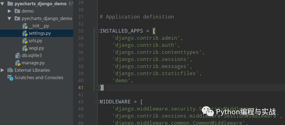 同時(shí)在pyecharts_django_demo/settings.py中注冊(cè)應(yīng)用程序INSTALLED_APPS中添加應(yīng)用程序demo