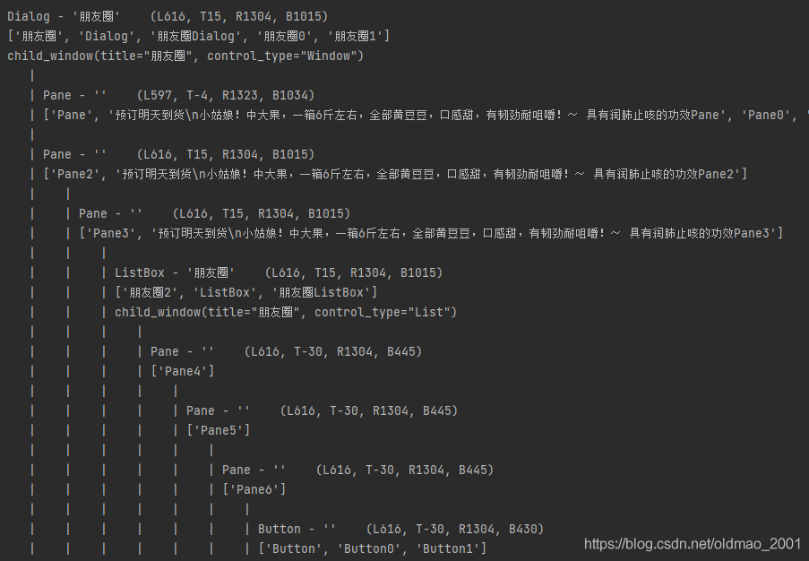 然后觀察,【title=“朋友圈”, control_type=“Button”】這句話在哪個控件下面,目前這個版本是在【Pane6】下面,因此用下面代碼獲取朋友圈按鈕
