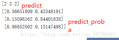 predict_proba返回每組數(shù)據(jù)預(yù)測值的概率,每行的概率和為1,如訓(xùn)練集/測試集有 下例中的兩個類別,測試集有三個,則 predict返回的是一個 3*1的向量,而 predict_proba 返回的是 3*2維的向量,如下結(jié)果所示。