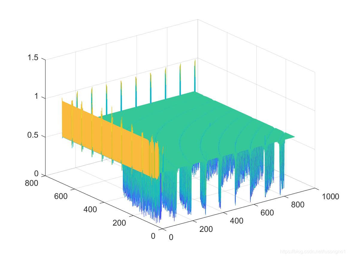 %% 顏色轉(zhuǎn)為 HSV,再進行色差計算 A2 = rgb2hsv(A); color2 = rgb2hsv(color); D = ones(low_num,col_num)*2; for i=1:low_num for j=1:col_num D(i,j) = color_dist(color2,A2(i,j,:)); end end mesh(D);