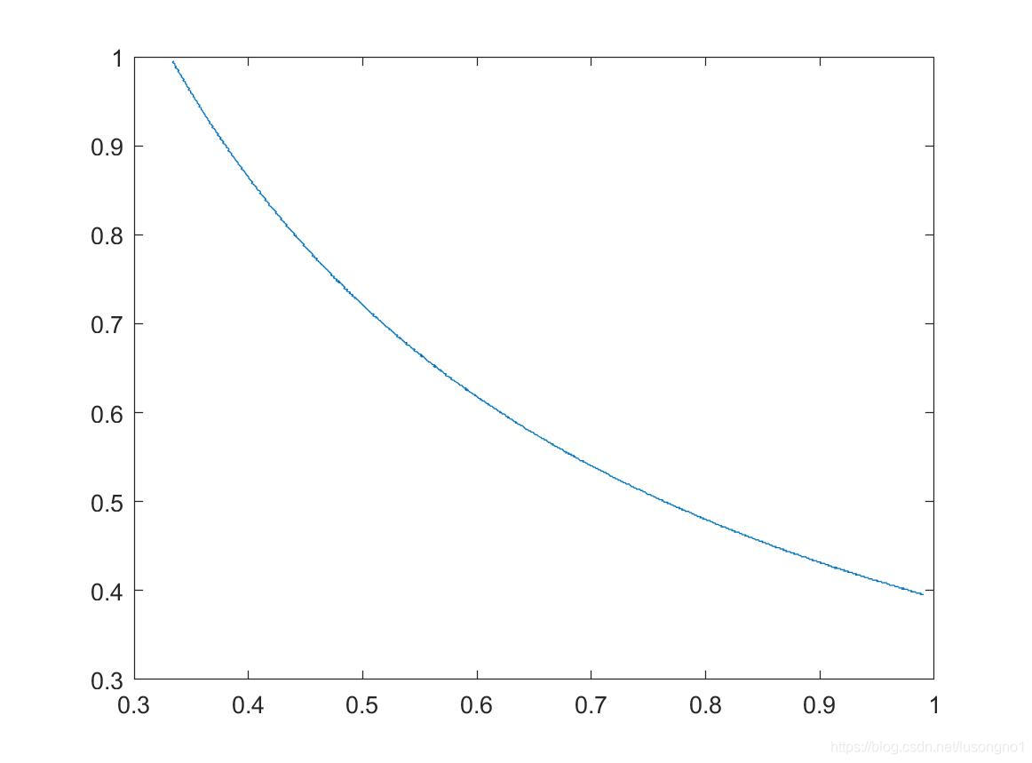 %% 二值化,提取數(shù)據(jù) leftUp = [0,1];%標注截取的圖片的左上角和右下角 rightDown = [1,0]; B = rgb2gray(A3); imshow(B); [pos_row,pow_col] = find(B~=255); Ps = [pos_row-1,pow_col-1]; Ps(:,1) = Ps(:,1)./(low_num-1); Ps(:,2) = Ps(:,2)./(col_num-1); x = (rightDown(1)-leftUp(1)).*Ps(:,2)+leftUp(1); y = leftUp(2)-abs(rightDown(2)-leftUp(2)).*Ps(:,1); scatter(x,y,0.38); X = [x,y];