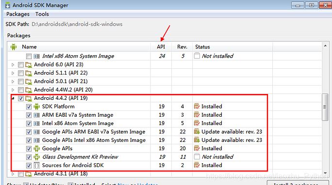 3.勾選你要下載的API版本和對(duì)應(yīng)的android版本,后面模擬器會(huì)用到(不下載用其它模擬器也行,或者真機(jī)),然后坐等下載