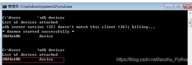 2.打開cmd輸入:adb devices,當(dāng)屏幕上出現(xiàn)一串字符,后面顯示devices說(shuō)明連接成功(出現(xiàn)其它的提示,得檢查自己的環(huán)境了)