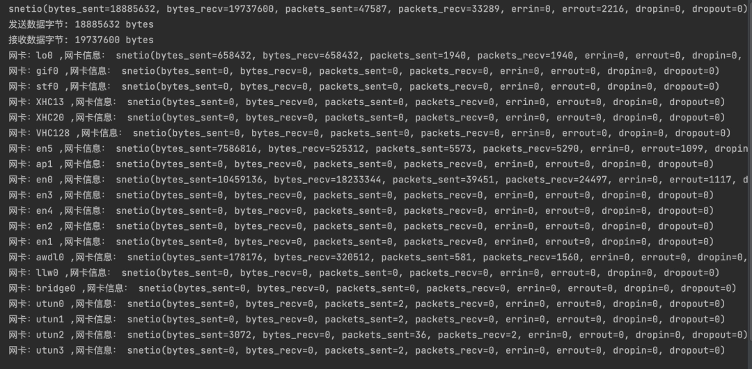 print("網(wǎng)卡:"+i+" ,網(wǎng)卡信息:",net_counter[i])