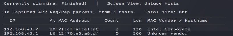nmap -PR -sL ip fping -asg ip netdiscover -i kali網(wǎng)卡 -r ip(網(wǎng)段) netdiscover -i eth0 -r 192.168.43.1/30