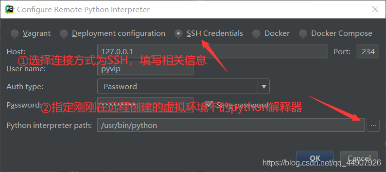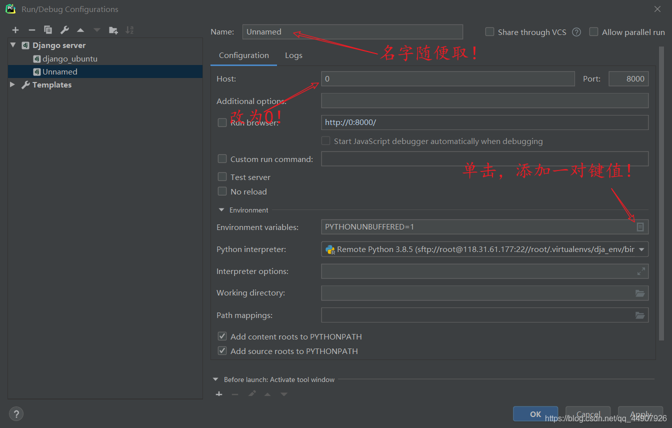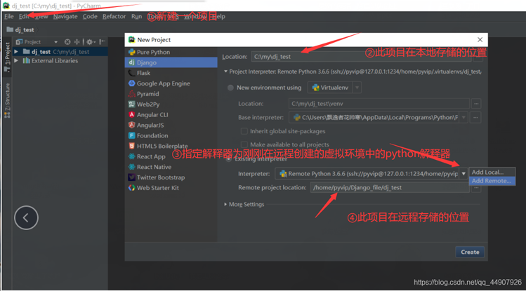 2.為Django項(xiàng)目指定遠(yuǎn)程中創(chuàng)建的虛擬環(huán)境下的python解釋器: