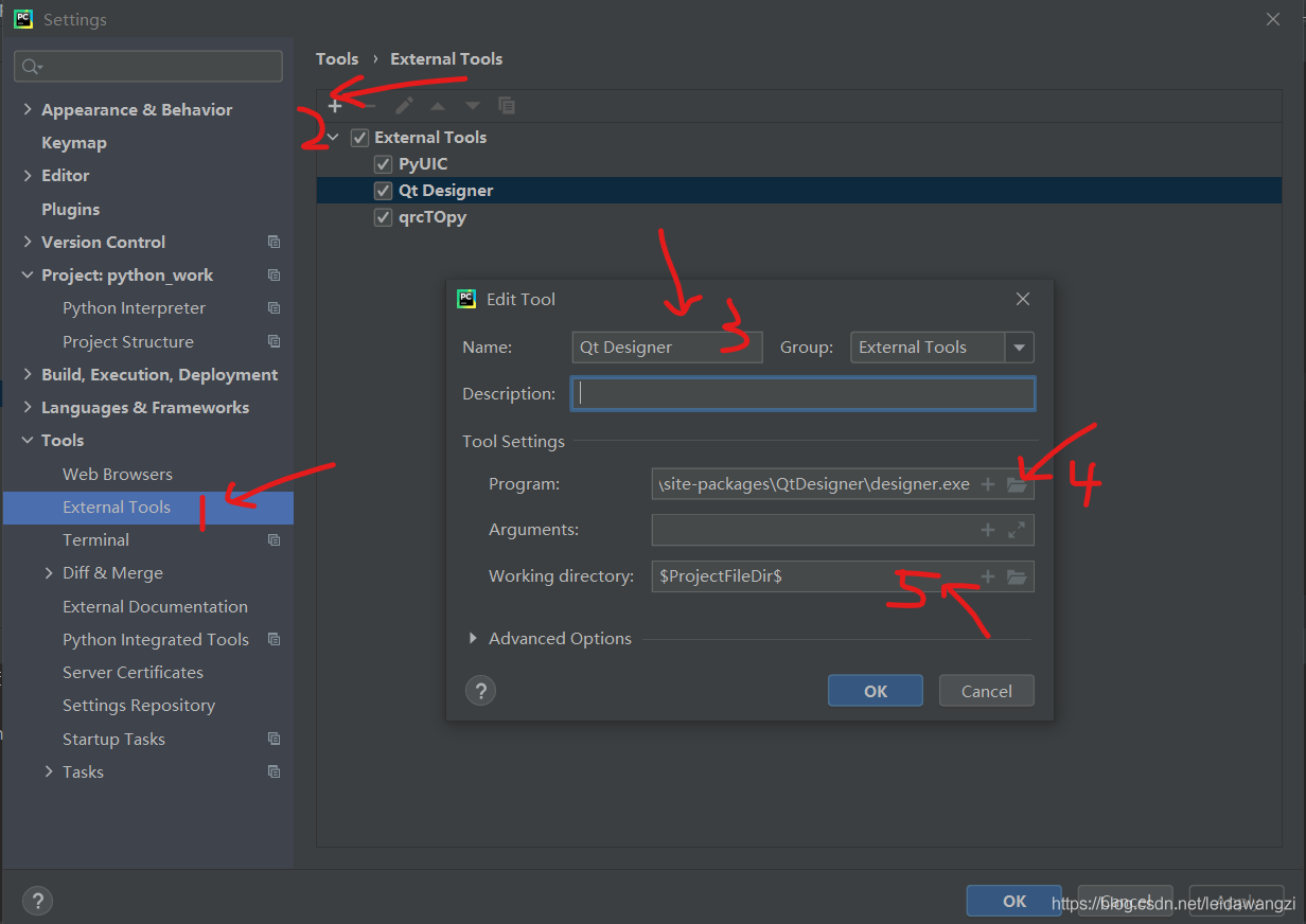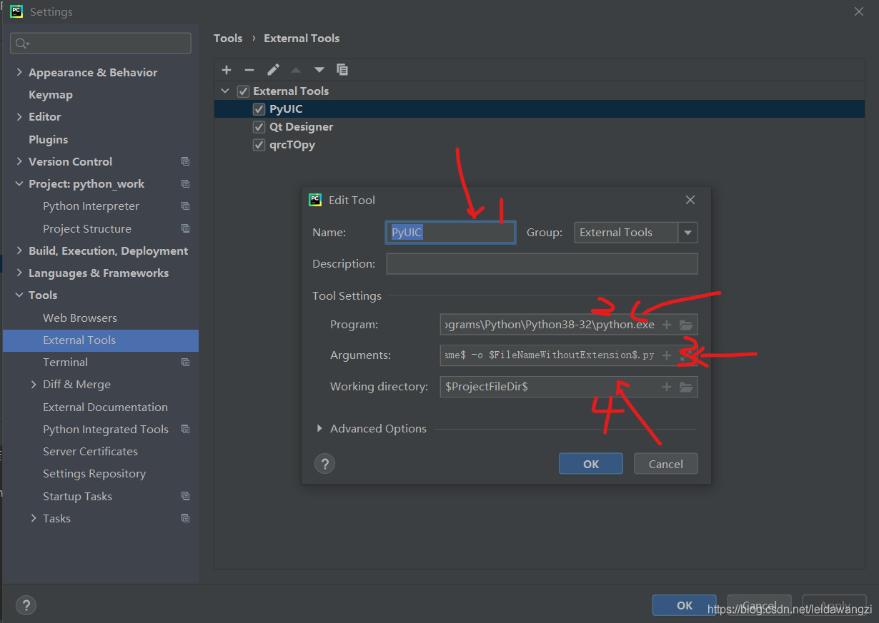 Arguements:填入-m PyQt5.uic.pyuic $FileName$ -o $FileNameWithoutExtension$.py 是將.ui文件轉化成.py文件的語句。