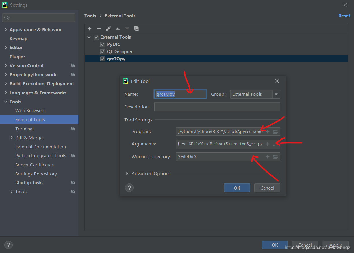 Arguements:$FileName$ -o $FileNameWithoutExtension$_rc.py將.qrc文件轉換成.py文件的語句。