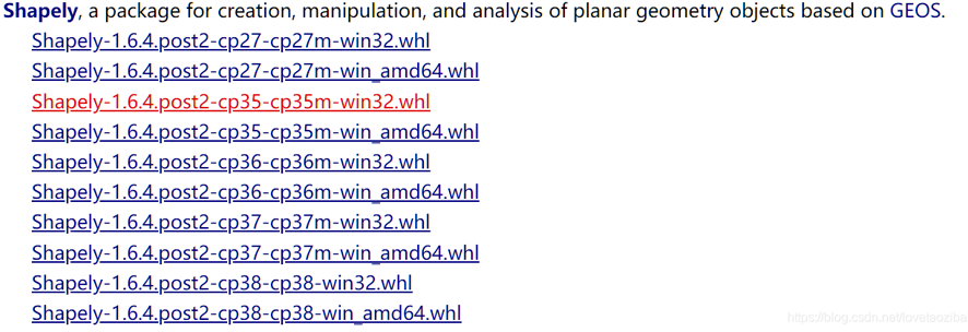 但是不知道為什么,用該方法安裝時(shí),一直報(bào)錯(cuò),后來(lái)直接從https://www.lfd.uci.edu/~gohlke/pythonlibs/#shapely (直接ctrl+F搜索shapely快速轉(zhuǎn)到下載位置)下載了該文件,用地址名安裝。