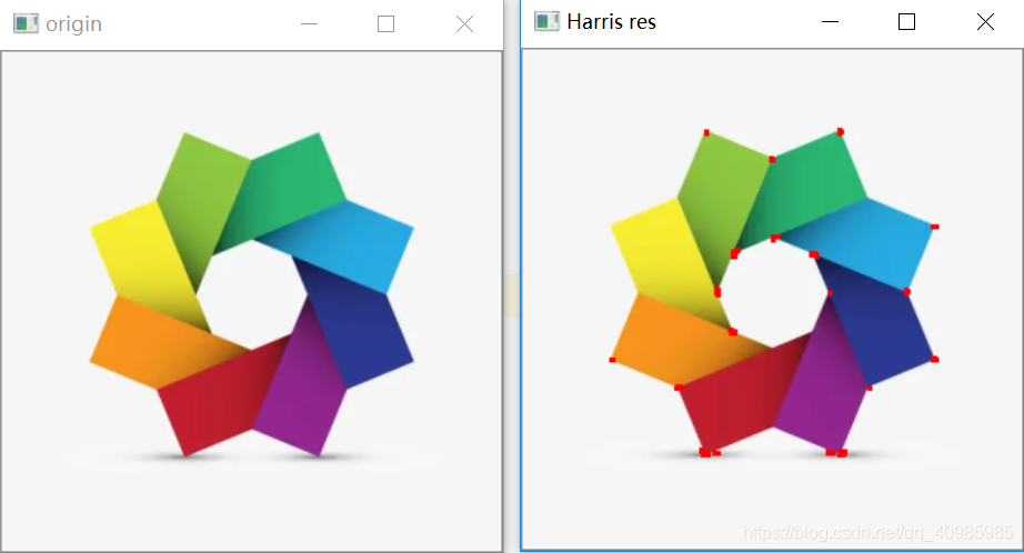 原圖 VS Harris角點(diǎn)檢測(cè)器效果如下: