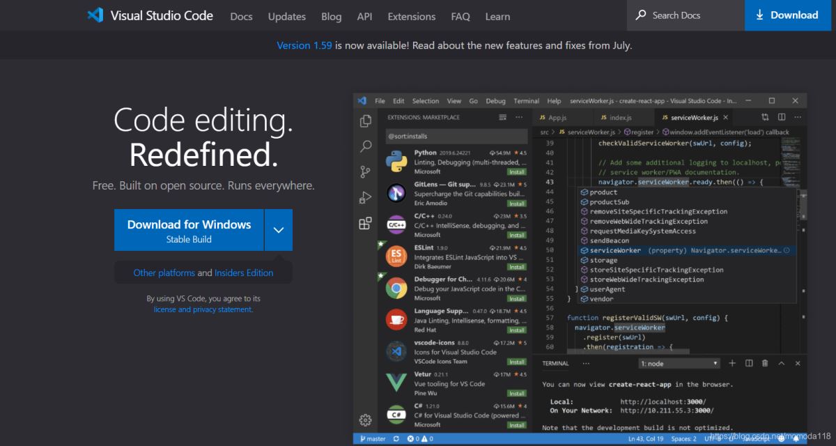 可能你會(huì)想,VSCode和那個(gè)龐大的Visual Studio名字這么像,它們會(huì)不會(huì)有什么關(guān)系呢?但其實(shí),并沒有,哈哈。VSCode默認(rèn)支持多種編程語(yǔ)言,并且有著豐富的擴(kuò)展。VSCode每月更新,你可以在微軟博客上隨時(shí)關(guān)注更新的進(jìn)展。微軟甚至把代碼開源在了Github上供所有開發(fā)者克隆倉(cāng)庫(kù)甚至貢獻(xiàn)代碼(暗示大家趕緊來(lái)提PR)。