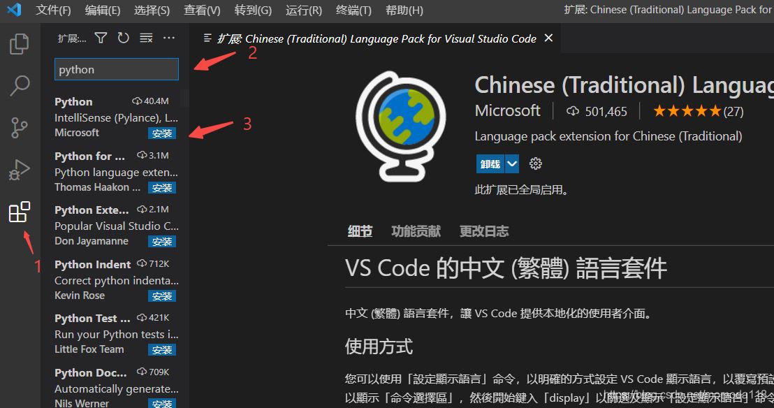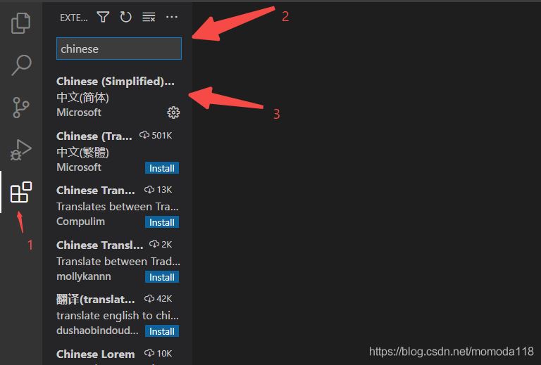 1)安裝完成后,打開VSCode按照下圖中紅色箭頭指示位置點(diǎn)擊步驟1指向,然后在彈出的搜索框中輸入chinese,然后選擇【Chinese (Simplified)Language Pack for Visual Studio Code】,然后點(diǎn)擊右側(cè)的【Install】進(jìn)行安裝