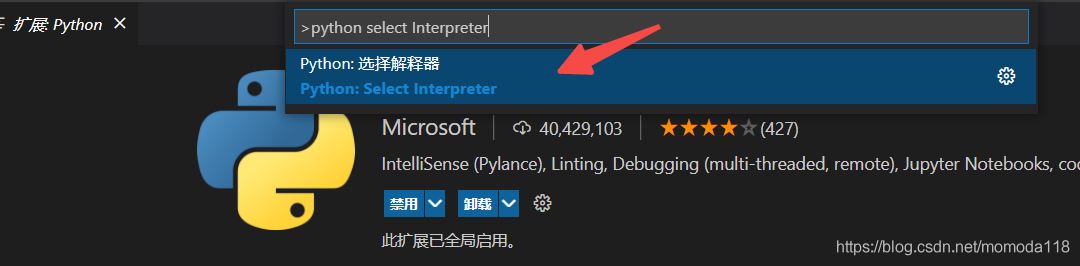 3)在彈出的搜索框輸入【python select Interpreter】并點(diǎn)擊圖中指向的選項(xiàng)