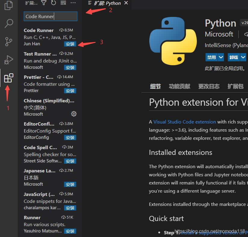 1)按照下圖中紅色箭頭指示位置,在搜索欄輸入【Code Runner】按步驟進(jìn)行安裝。