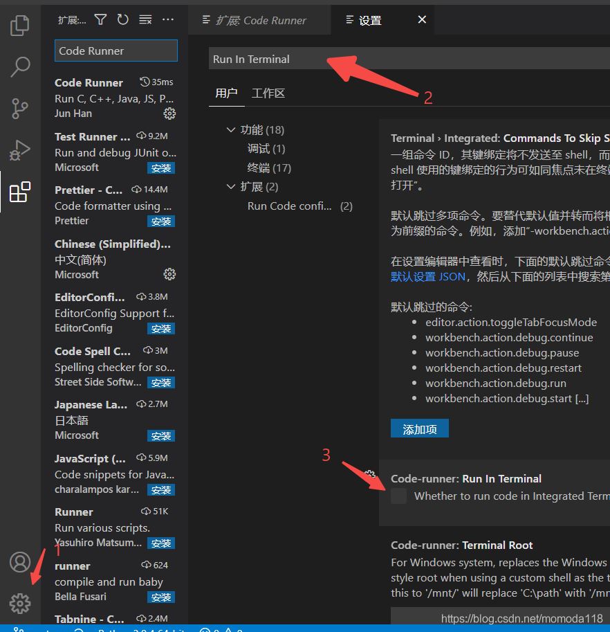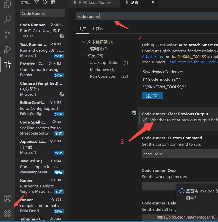 2)安裝好Code Runner之后,按照下圖中紅色箭頭指示位置,在搜索欄輸入【Code Runner】按步驟進(jìn)行配置:在每次運(yùn)行前清除以前的輸出