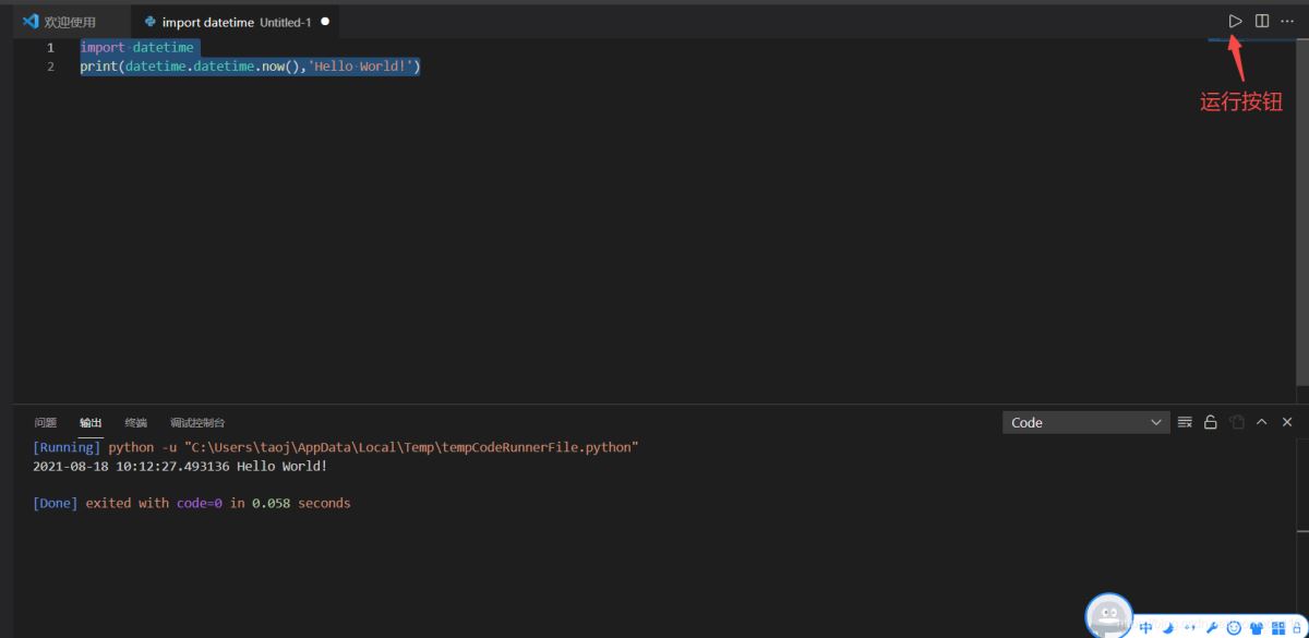 2)輸入下面的代號(hào)后,點(diǎn)擊VSCode右上角的小三角符號(hào)運(yùn)行程序