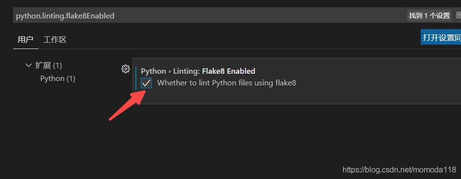 2)安裝flake8成功后,打開VScode,文件->首選項(xiàng)->用戶設(shè)置,在settings.json文件中輸入"python.linting.flake8Enabled": true