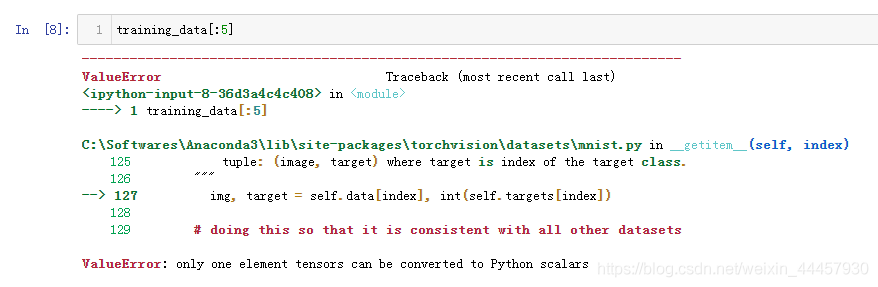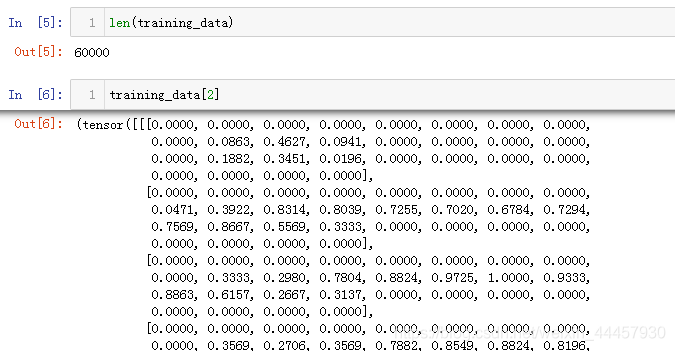 上面的程序中,有兩個(gè)地方指的注意,一個(gè)是可以求training_data的長(zhǎng)度,另一個(gè)可以通過(guò)索引獲得單個(gè)樣本,當(dāng)然這里的樣本已經(jīng)被轉(zhuǎn)換成了張量,如下圖所示