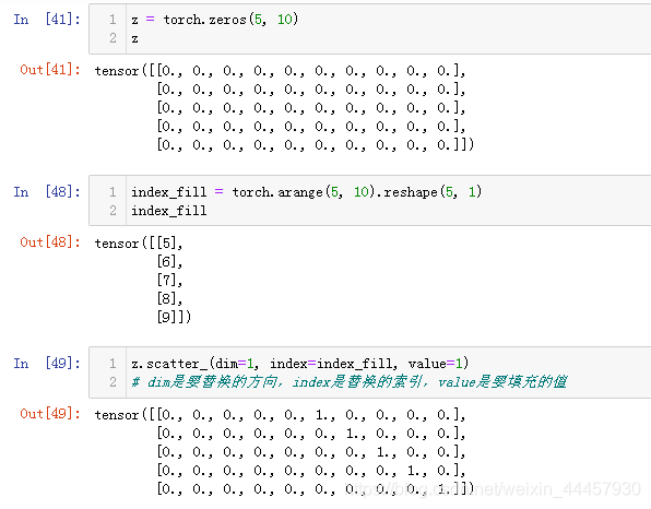 Lambda可以用于任何用戶定義的lambda函數(shù),在這里,我們定義一個(gè)函數(shù)來(lái)將整數(shù)轉(zhuǎn)換為一個(gè)one-hot編碼張量,首先建立一個(gè)長(zhǎng)度為10的0張量(之所以為10,是因?yàn)橛?0個(gè)類(lèi)別),然后調(diào)用scatter_函數(shù),把對(duì)應(yīng)的位置換成1。scatter_函數(shù)的用法如下: