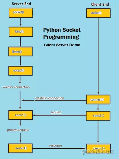 到目前為止,我們已經(jīng)列出了“socket”庫為 Python 套接字編程提供的所有套接字工具。接下來,我們將向您展示實(shí)現(xiàn)客戶端-服務(wù)器通信的套接字函數(shù)調(diào)用工作流程。請參考以下快照。它說明了在客戶端和服務(wù)器之間建立通道所需的每個(gè)套接字調(diào)用。