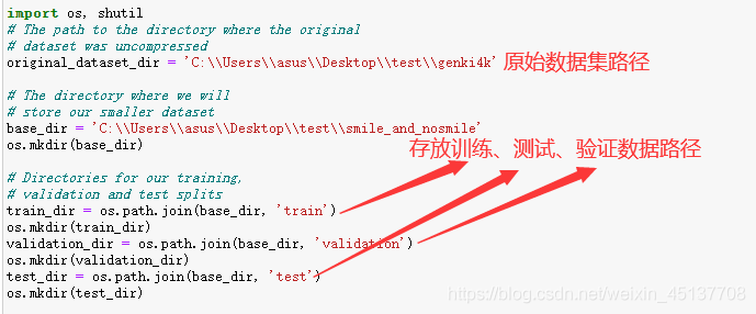 import os, shutil # The path to the directory where the original # dataset was uncompressed original_dataset_dir = 'C:\\Users\\asus\\Desktop\\test\\genki4k' # The directory where we will # store our smaller dataset base_dir = 'C:\\Users\\asus\\Desktop\\test\\smile_and_nosmile' os.mkdir(base_dir) # Directories for our training, # validation and test splits train_dir = os.path.join(base_dir, 'train') os.mkdir(train_dir) validation_dir = os.path.join(base_dir, 'validation') os.mkdir(validation_dir) test_dir = os.path.join(base_dir, 'test') os.mkdir(test_dir) # Directory with our training smile pictures train_smile_dir = os.path.join(train_dir, 'smile') os.mkdir(train_smile_dir) # Directory with our training nosmile pictures train_nosmile_dir = os.path.join(train_dir, 'nosmile') os.mkdir(train_nosmile_dir) # Directory with our validation smile pictures validation_smile_dir = os.path.join(validation_dir, 'smile') os.mkdir(validation_smile_dir) # Directory with our validation nosmile pictures validation_nosmile_dir = os.path.join(validation_dir, 'nosmile') os.mkdir(validation_nosmile_dir) # Directory with our validation smile pictures test_smile_dir = os.path.join(test_dir, 'smile') os.mkdir(test_smile_dir) # Directory with our validation nosmile pictures test_nosmile_dir = os.path.join(test_dir, 'nosmile') os.mkdir(test_nosmile_dir)