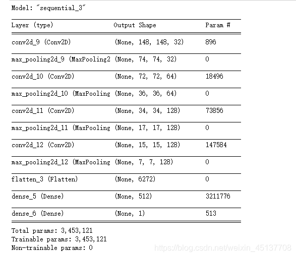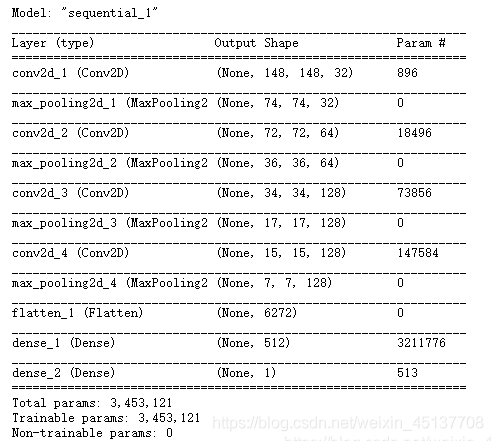 from keras import layers from keras import models from keras import optimizers model = models.Sequential() #輸入圖片大小是150*150 3表示圖片像素用(R,G,B)表示 model.add(layers.Conv2D(32, (3,3), activation='relu', input_shape=(150 , 150, 3))) model.add(layers.MaxPooling2D((2,2))) model.add(layers.Conv2D(64, (3,3), activation='relu')) model.add(layers.MaxPooling2D((2,2))) model.add(layers.Conv2D(128, (3,3), activation='relu')) model.add(layers.MaxPooling2D((2,2))) model.add(layers.Conv2D(128, (3,3), activation='relu')) model.add(layers.MaxPooling2D((2,2))) model.add(layers.Flatten()) model.add(layers.Dense(512, activation='relu')) model.add(layers.Dense(1, activation='sigmoid')) model.compile(loss='binary_crossentropy', optimizer=optimizers.RMSprop(lr=1e-4), metrics=['acc']) model.summary()