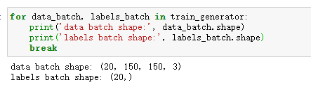 讓我們看看其中一個生成器的輸出:它生成150×150 RGB圖像的批次(Shape(20,150,150,3))和二進制標簽(Shape(20,))。20是每批樣品的數(shù)量(批次大小)。注意,生成器無限期地生成這些批:它只是無休止地循環(huán)目標文件夾中的圖像。因此,我們需要在某個點中斷迭代循環(huán)。
