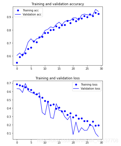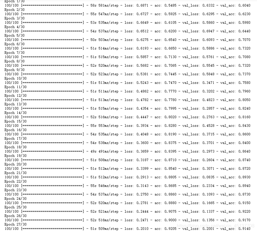 history = model.fit_generator( train_generator, steps_per_epoch=100, epochs=30, validation_data=validation_generator, validation_steps=50)