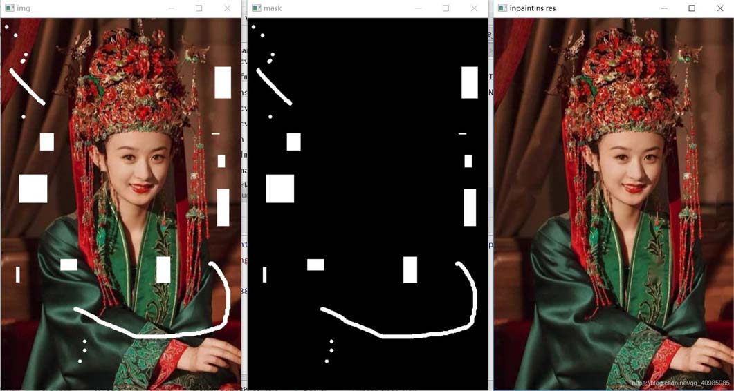 mask圖是與原始圖具有相同大小,并且只有被污染的區(qū)域是白色像素的圖。可以看到修復(fù)效果還是挺好的~