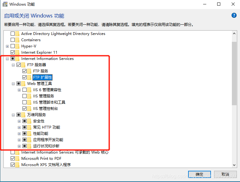 1、打開的【W(wǎng)indows功能】,將 Internet 信息服務(wù)的 4 個子功能打勾“√”,然后點擊【確定】按鈕安裝這些功能,圖示如下: