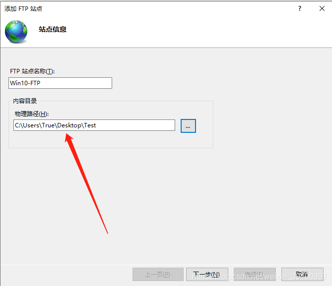 輸入 FTP 站點名稱,以及允許用戶訪問的目錄路徑,圖示如下: