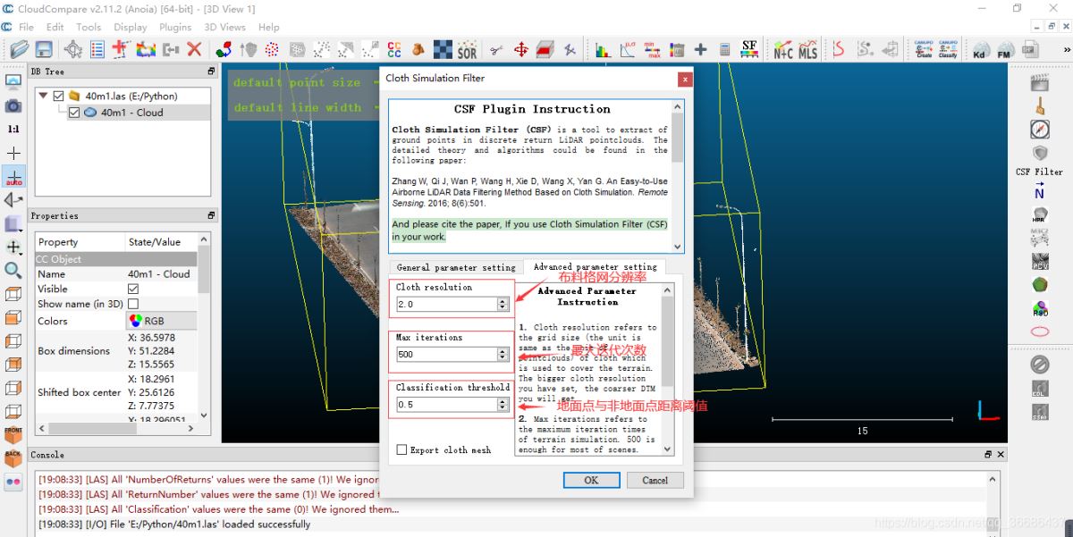 圖中:Cloth resolution:是指用于覆蓋地形的布的網(wǎng)格大小(單位與點(diǎn)云的單位相同)。你設(shè)置的布分辨率越大,你得到的DTM就越粗糙;Max iterations:是指地形仿真的最大迭代次數(shù)。500對(duì)大多數(shù)場(chǎng)景來(lái)說(shuō)都足夠了。Classification threshold:是指根據(jù)點(diǎn)與模擬地形之間的距離,將點(diǎn)云劃分為地面和非地面部分的閾值。0.5適用于大多數(shù)場(chǎng)景