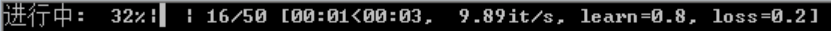 for i in tqdm(range(50),desc='進行中',ncols=10,postfix=d): #desc設(shè)置名稱,ncols設(shè)置進度條長度.postfix以字典形式傳入詳細信息